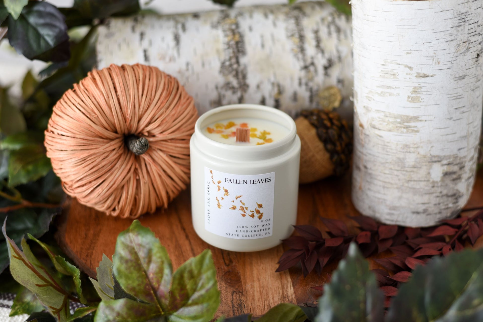 Wrap yourself in the smell of crisp fall air with our Fallen Leaves candle. This warm and inviting fragrance starts with top notes of cinnamon, leading into middle notes of apple and green leaves, and falls into a steady base note of cedar. Topped with candle-safe decorative leaves, this candle will have you falling in love with fall.