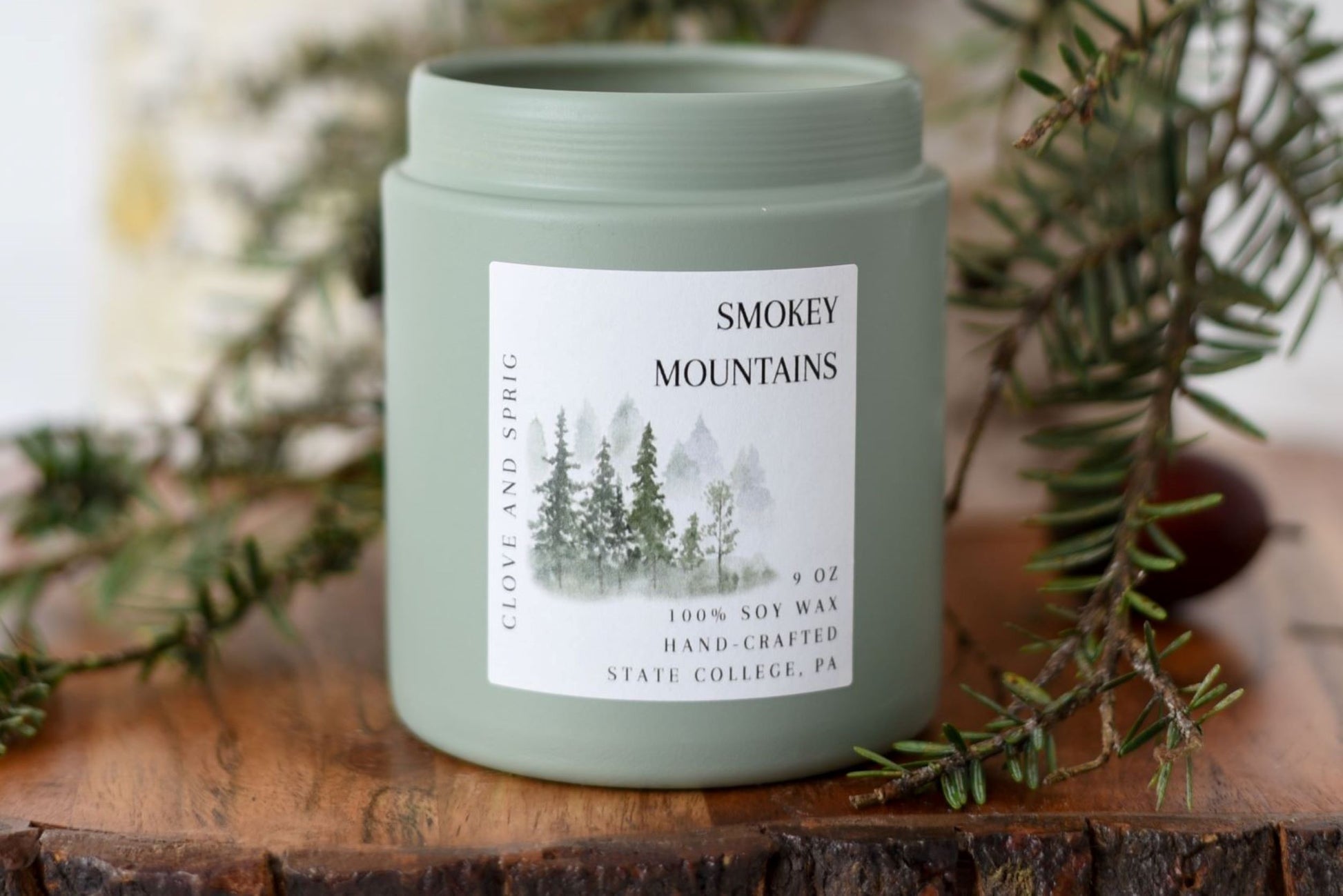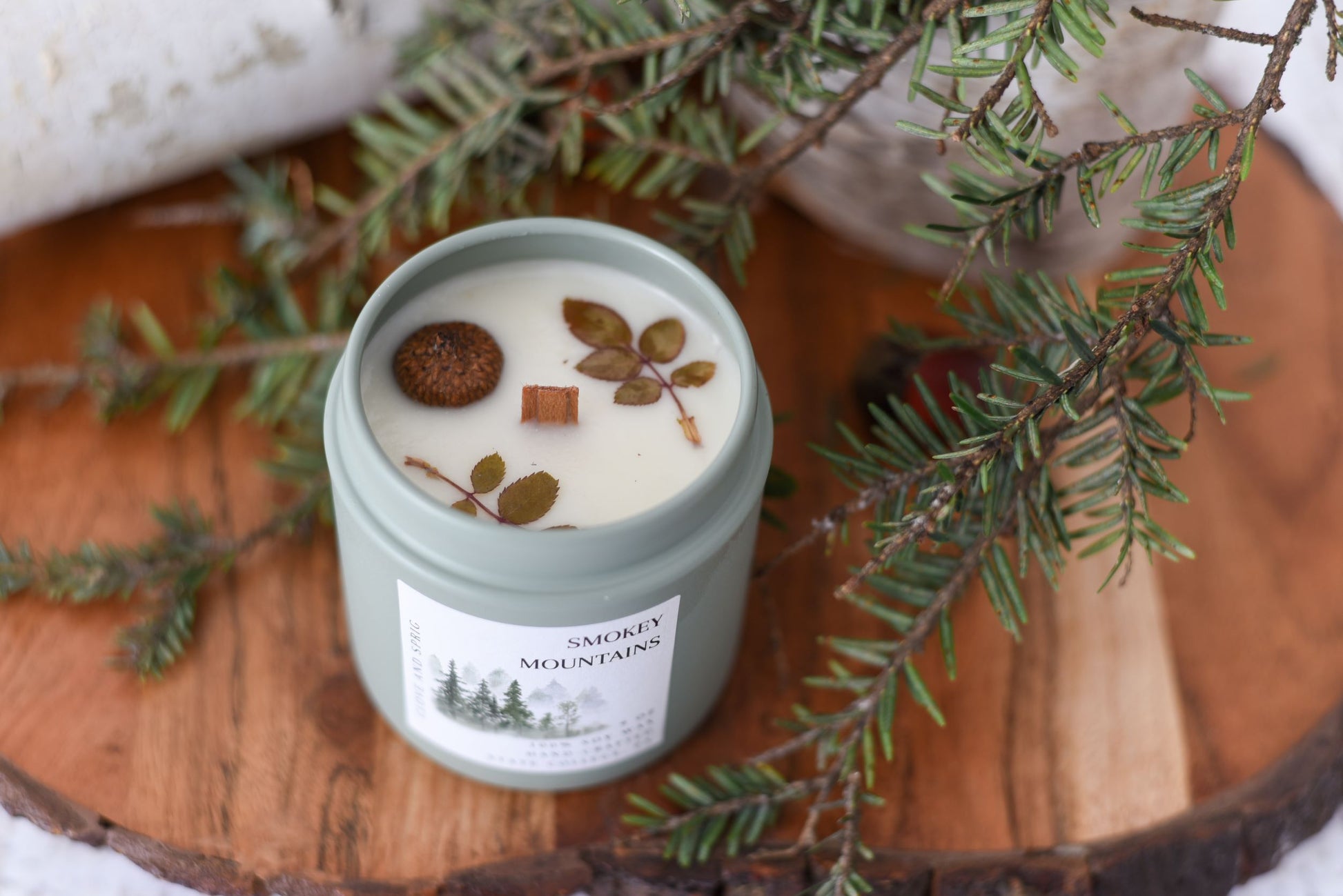 Topped with pressed leaves and acorn tops, this candle transports you right into the forest, no matter where you light it. Our handcrafted Smoky Mountains candle adds a new layer of sophistication to traditional woodsy scents. A perfect combination of campfire and forest, this scent leads with an initial hint of smoke and suede, into steady base notes of white birch and cedar.
