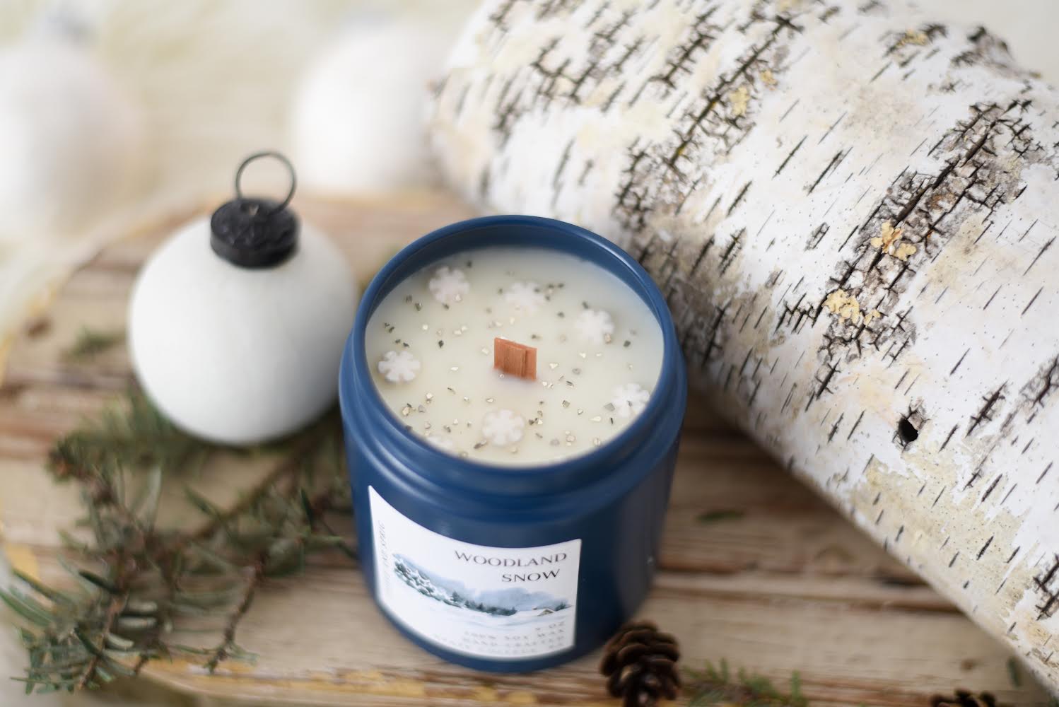 Imagine the view of a peaceful and serene forest, branches heavy with white, glittering snow. The feeling of a cozy cabin, mixed with crisp, cool air. The sensation of wrapping yourself in a lush blanket, surrounded by the scent of cashmere, cypress, and cedar. Woodland snow is perfect for the winter months, giving your home just the right blend of cozy indoors and earthy outdoors. Poured into a navy container, this 9 oz. candle is topped with snowflakes and glittering fragments to mimic the appeal of fresh-fallen snow.